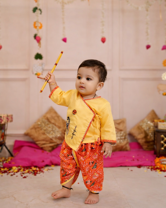 Little Krishna Vibes – Yellow Pichwai Dhoti Kurta for Baby Boys