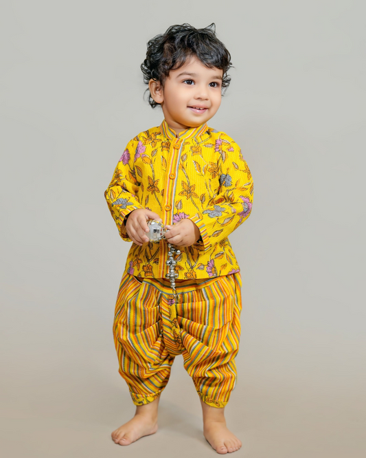 Little Krishna Vibes – Yellow Pichwai Dhoti Kurta for Baby Boys