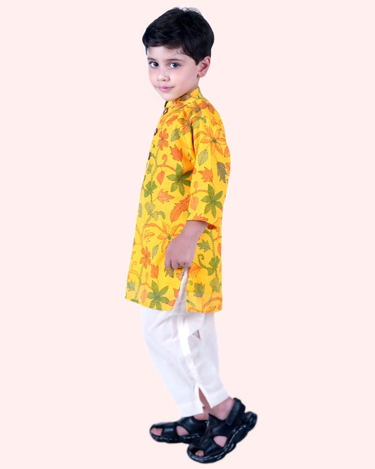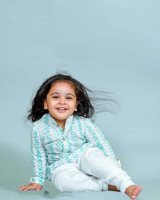 Baby Boy White Hand Block Print Kurta With Pyjama