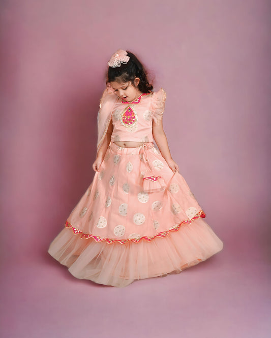Girls Pink Chanderi Gota Motif Work Top With Lehenga And Dupatta