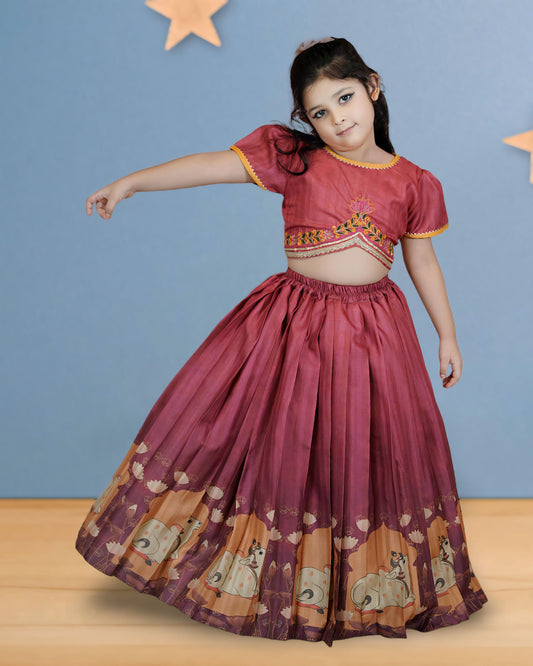 Girls Embroidered Ajrakh Print Pure Chanderi Silk Lehenga