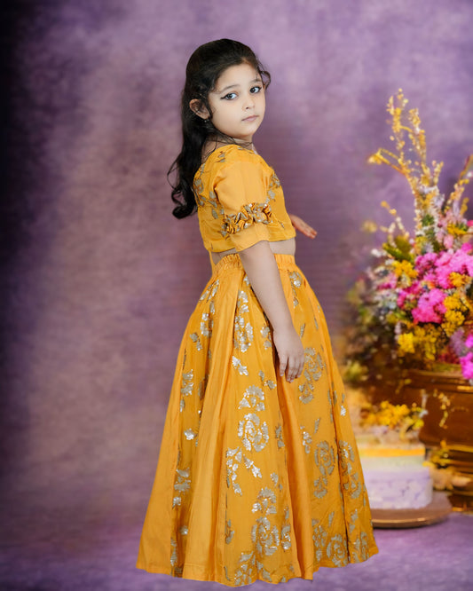 Girls Mustard Pure Chinon Siquense Work Lehenga Set