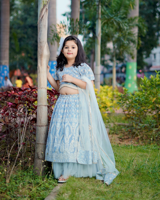 Girls Icy Blue Pure Lakhnavi Embroidered Lehenga Set