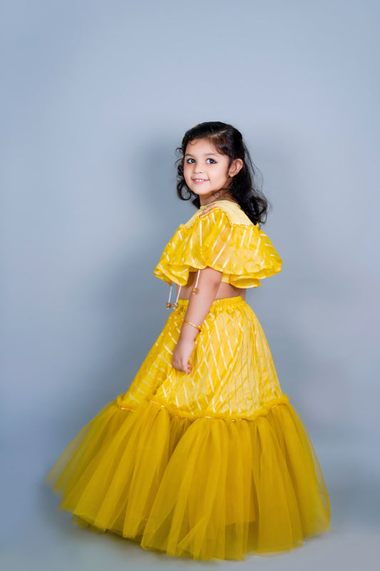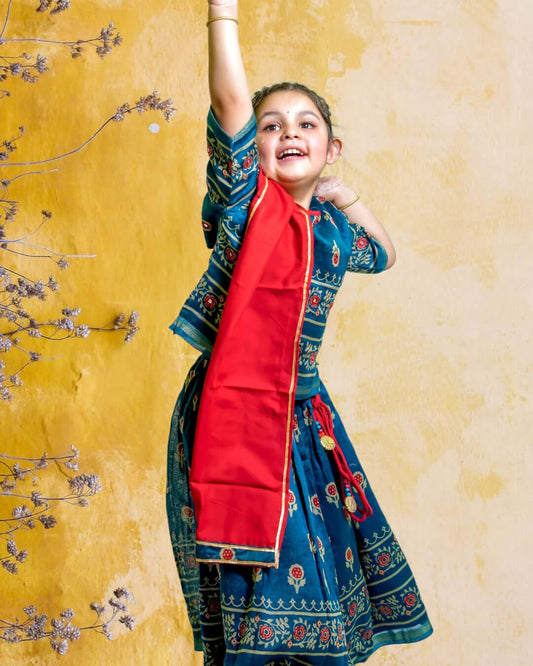 Girls Embroidered Ajrakh Print Pure Chanderi Silk Lehenga