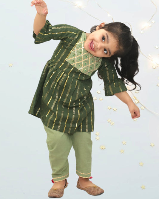 Girls Embroidered Cotton Lurex Green Kurta with Straight Pant