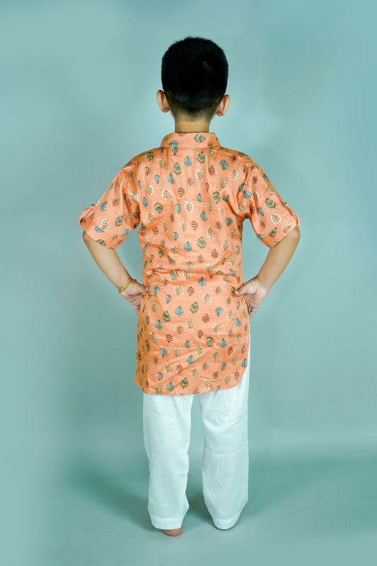 Boys Peach Cotton Silk Leaf Print Kurta With Pyjama