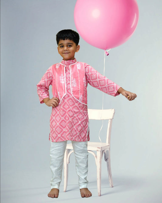 Boys Printed Pink Cotton Kurta With Attached Pintuck Jacket And Churidar