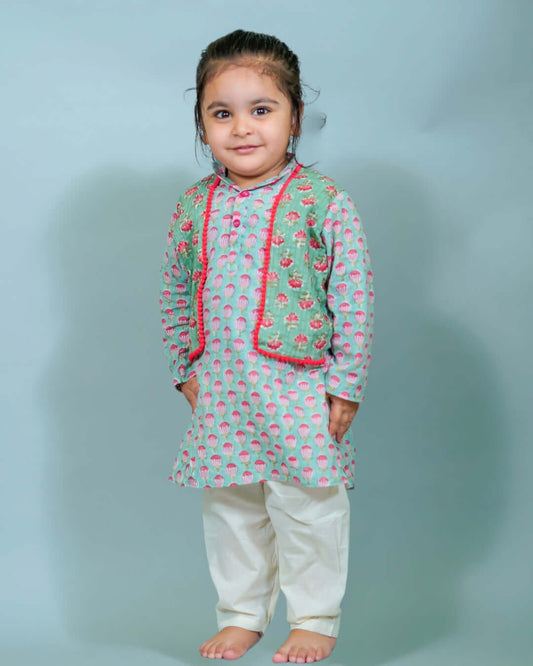Lotus Hand Block print kurta with attached pintuck jacket And Pant