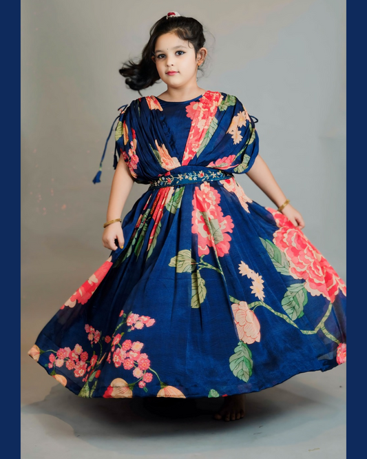 Girls Pure Chinon Floral Print Blue Anarkali With Embroidered Belt