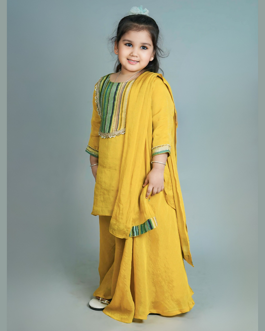 Girls Tissue Silk Mustard Suit Set with Embellished Neckline