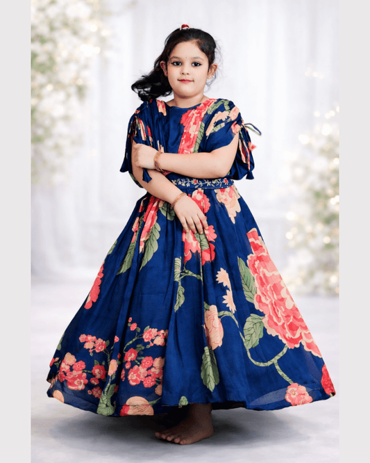 Girls Pure Chinon Floral Print Blue Anarkali With Embroidered Belt